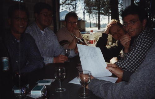 In 1998 raken we niet uitgepraat over de creatie van Jantje Wever: naast een schotse ruit en een echte opplaksnor, huurt Jan voor heel veel geld een pruik ‘van echt hondenhaar’. Een succes wordt de creatie niet, maar de hilariteit is groot als enkele feestvierders onder de rok van Jan kijken. In plaats van een blote snikkel (dat was pas gedurfd geweest Jan) treffen ze daar een witte onderbroek met daarop een getekende piemel. Helaas, geen foto's. Jan eist voor altijd zijn slaapplaats op en wel onder de tafel in de keuken. Ook doet het begrip ‘huisje 25’ zijn intrede. Iedereen wil dicht bij de voorzieningen op het park zitten, maar wij hebben een andere voorkeur: hoe dichter bij de poort, des te beter. Het carnavalfeest staat in 2000 in het teken van paters, advocaten en priesters. Legendarisch is de actie van Marcel: hij blijft vrijdagavond al ziek in het huisje en vertrekt de volgende morgen voor dag en dauw uit Beekse Bergen. Er is 2000 nog geen sprake van collectieve kostuums, dus moeten we het hebben van eigen creativiteit: Johan huurt een advocatenpak, neemt voor Marcel een ongebruikt priesterkostuum mee en Jan gaat zwart geschminkt als Puffy, op dat moment een grote ster. Klaas regelt een speenvarkenpak van z'n broertje en Sietse gaat als pooier en voelt zich in die creatie goed thuis, zo blijkt al snel. De outfit van Eddie als Japanse was uiterst teleurstellend, niet in de laatste voor hemzelf. Ramon ging dit jaar (…) een dag eerder naar huis om op zaterdagavond ‘nog wat dingetjes te doen’ en een visum te regelen. En was dit nou het jaar dat Eddie een bruidje aan de haak sloeg? Ramon stuurt bij de uitnodiging voor 2001 nog een kleine terugblik naar 2000 mee. Ramon regelt zoals gezegd huisje 25 op Beekse Bergen. Sneeuw ontregelt de planning, maar het levert wel pittoreske foto's op