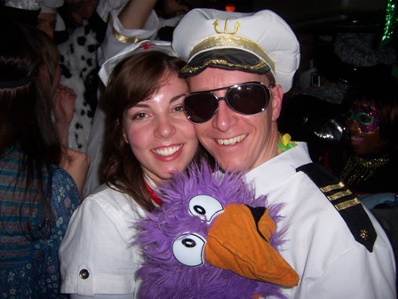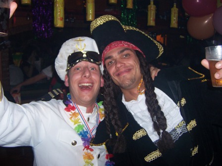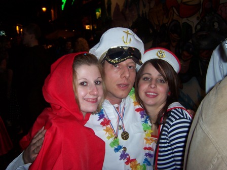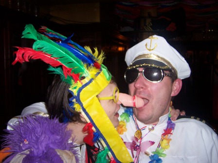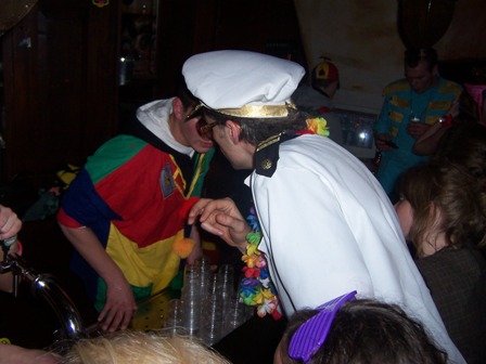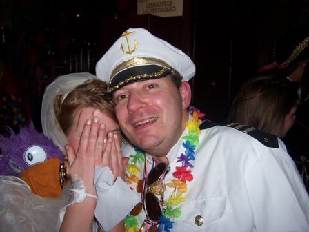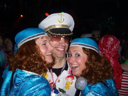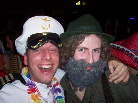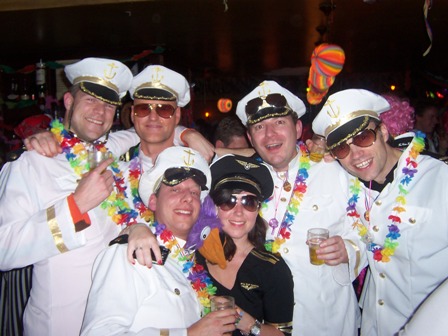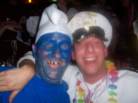 2009: De Marine III Het geavanceerde (handmatige) navigatiesysteem van Jan W. bracht ons om 17.00 uur naar ‘De Seterse Hoeve’ in Oosterhout (zonder het ski-duo Johan en Marcel). Hier kregen we (voorlopig) op kosten van Ramon een etentje aangeboden geheel in de vertrouwde Beekse Bergen stijl: smakeloos met één saus voor alle gerechten. Eddie kondigde zijn aanstaande vaderschap aan (met champagne), Ramon had op dit vroege tijdstip nog geen zin in vlees en Jan’s lift verhaal uit Boston zat niet waterdicht (‘ping’). Voor het eerst in de historie werd voor de derde keer hetzelfde pak uit de kast c.q. winkel gehaald. Bij de aantrekkingskracht van dit maagdelijke witte kostuum kunnen ‘toppers’ uit voorgaande jaren, zoals pater- en kabouterpakken, niet in de schaduw staan. Jan B. vond het pak dit jaar niet helemaal slimfit. Jan W’s ‘bril over bril’ actie maakte hem gelijk een stuk knapper. Klaas hield het dit jaar langer vol dan 23.00 uur door het overslaan van de middagborrel in het Tribunaal. Hans verloor (met blauwe vogel) al na twee minuten zijn pet in de drab van Polly en Sietse werd maar niet dronken door zijn bril met veel te lang slangenstelsel. Verder op vrijdag: | | Groep stapt op de heenweg in verkeerde taxi en wordt teruggebracht. | | | In het verleden gelegde contacten zijn geen garantie voor de toekomst (‘waarom hebben jullie dit jaar geen aandacht voor mij?)’ | | | Hans wint voetbal Triviant | | | Voortreffelijke taxidienst Ali ‘ik rijd door alle rode stoplichten’ Chemicali | | | Blauwe vogel verliest X-factor (advies: wassen op 90 graden) |