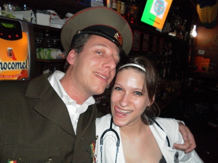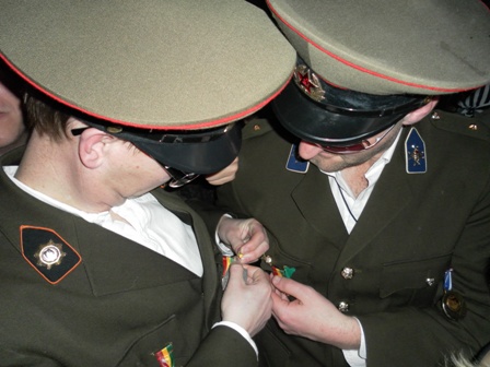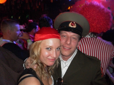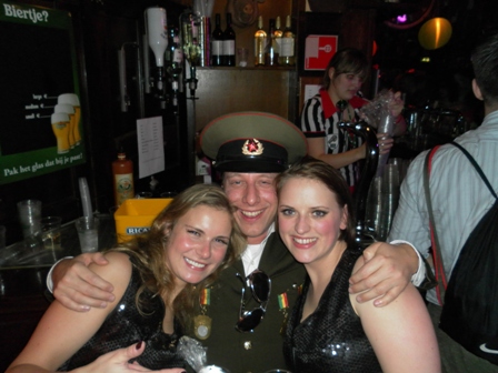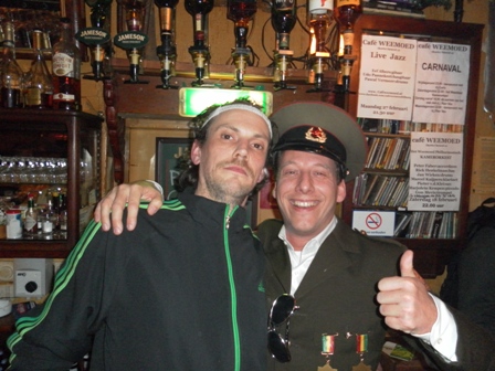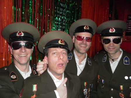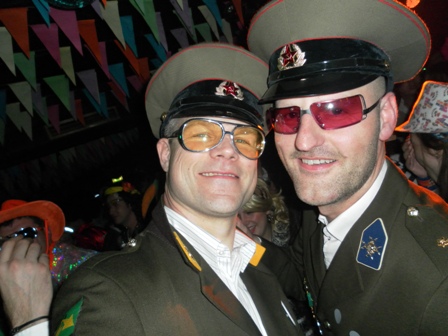2012: De Gestapo De voorbereidingen waren als vanouds (op donderdagavond stonden nog 3 man in diverse winkels zicht te oriënteren op tuinlaarzen, paardrijlaarzen, scheenbeschermers en stropdassen), een aantal afzeggingen ook. De formule was wel anders, huisvesting in een hotel in het centrum met ontbijt (dat laatste alleen op de factuur overigens, want 10.00 uur was te vroeg zaterdagochtend). Een mislukte oriëntatie op seventies pakken resulteerde uiteindelijk in een kwalitatief prachtige outfit met Oostblokachtige accenten. De één noemde het 'sexy en stoer', de ander zag er meer een 'homo paardrijdclub' in. De opmerking 'wij zijn van de administratie' deed het imago in iedere geval geen goed, maar dat deerde Maja de Bij geenszins. Na 15 jaar te zijn weggestopt op menig vakantiepark was het een openbaring hoe het er werkelijk aan toe gaat op zaterdag overdag. Wij waren de enige niet verkleed in de kroeg en vielen dus al gauw door de mand, maar prietpraat genoeg. De zaterdagavond voorspelde niet veel goeds. Met veel tijdrekken op onze televisiekamer (....), de documentaire van Jan Mulder was best leuk, en de opmerking ''ik zie er als een berg tegenop'' werden de stoute laarzen weer aangedaan. Het werd een zeer aangename kroegentocht. Zelf hadden we het thema ''vreemde snuiteravond'' verzonnen en die kwamen we dan ook veel tegen. Onderweg wat manschappen een medaille opgespeld, een bewusteloze carnavalsvierder (die nota bene bovenop onze mooie laarzen viel!) de kroeg uitgesleept en nog een leuke anekdote. In een klein stamkroegje op de heuvel hadden veel gasten plastic glazen en een paar gasten glazen van glas. Op de vraag waarom zij glas had zei ze ''dat hebben alle stamgasten''. Toen dezelfde vraag aan de barman werd gesteld verwachte je hetzelfde antwoord, maar niets was minder waar ''zij heeft een glas, omdat ze dikke tieten heeft''. Gelukkig kon ze er zelf ook om lachen ....................