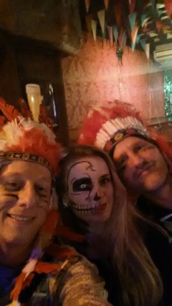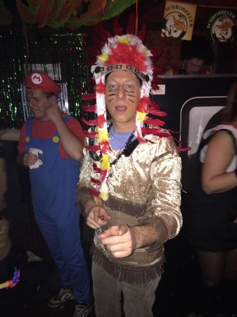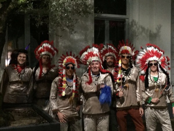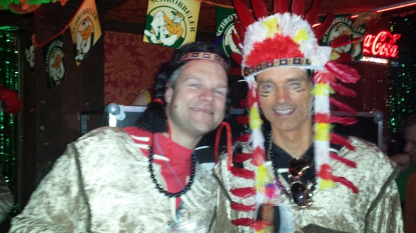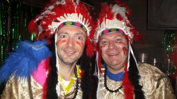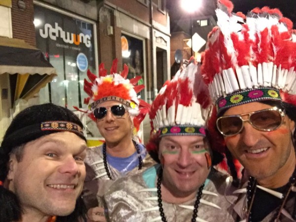 2016: De Indianen Een grote opkomst in 2016 met acht Guys, alleen Johan werd gemist. Aan de pakken kan dat niet gelegen hebben, want de scepsis was dit jaar groot. Het duo Sietse & Ramon regelde zonder verdere inspraak een tweedehands indianen-outfit met prachtige doch ietwat strakke hoofdtooien. Eddie gaf om onduidelijke reden de voorkeur aan de enkele veer en was daarmee de Hiawata danwel Pocahontas van de groep. 'Springend Hert' Jan W. deed een vroege variant op de Horlepiep maar viel daarna alleen nog op door de enorme gaten die in zijn tooi vielen. Sietse kondigde een dienende rol aan en hield dat tot een uur of twee aardig vol. Polly was als vanouds het doel, hoewel daar verder niemand rondliep in de eigen leeftijdsklasse, maar onder elkaar heb je daar natuurlijk ook maar weinig last van. Het onderkomen Pinos was acceptabel, vooral qua loopafstand, al was de twijfelaar wel heel smal en voor het luchtbed van Jan B was ook al niet veel ruimte. Van de zaterdagavond voor de die-hards werd weinig meer vernomen, de helft haakte daarvoor dan ook al op tijd af...