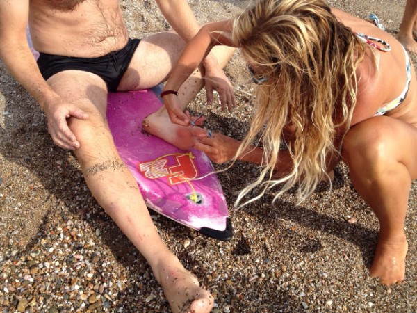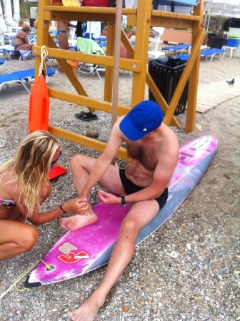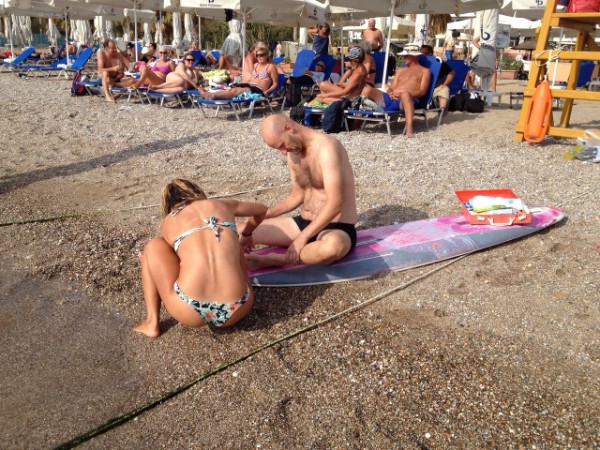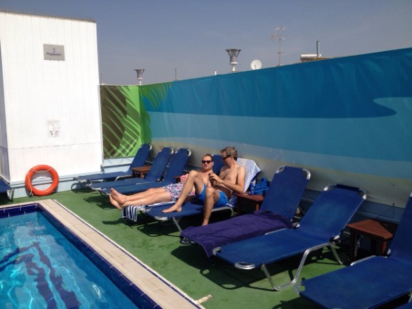 Uitslapen kan op een stretcher op de rooftop, al geven sommigen er de voorkeur aan om lang in bed te blijven. Het strand lokt echter en is dichtbij, het zeewater aangenaam warm. Volleybal blijkt populair, al zal het door Eddie met veel moeite meegesleepte volleybalnet in de koffer blijven. Sietse vindt de vrouwelijke Baywatch-op-leeftijd leuk en stapt vermoedelijk opzettelijk tot twee keer toe (op vrijdag en op zaterdag) in een zee-egel. Ramon maakt ruzie met de schone barvrouw van de rooftopbar, of zij met hem, dat blijft onduidelijk. De zaterdagavond doen we het rustig aan. Na het inkopen van prullaria voor het thuisfront kiezen we zoals zo vaak weer niet voor een van de gezellige restaurants, maar voor een sjofel terras op plastic stoelen (met opnieuw uitzicht op de Akropolis). De zelfgestookte ouzo van de eigenaar wordt in plantenbakken gekieperd. Daarna op naar een of andere uitgaanswijk, waar het erg gezellig leek maar waar wij het erg rustig aan doen. Zoals vaker de laatste jaren.