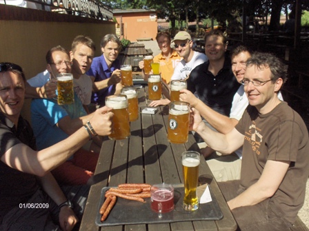 Sietse introduceert het literair genootschap door negen exemplaren van ‘Alleen maar nette mensen’ uit te delen. Een uitstekende zet, zo zal later blijken. Minder geslaagd voor hem is de zgn. ‘bijtellingdiscussie’ en ook het ‘luikje’ zal hem nog lang blijven achtervolgen. Jan B. vliegt een dag eerder vanwege een onmisbaar (.....) zakelijk voorzitterschap met Sandra H. terug. De rest volgt gewoon een dag later per auto en neemt en passant de nodige omleidingen en sluiproutes mee vanwege grote ongelukken op de Autobahn. Het was, met het zeilweekend in het achterhoofd, allemaal uitstekend geregeld door de zittende organisatie 2008 / 2009. Hulde.