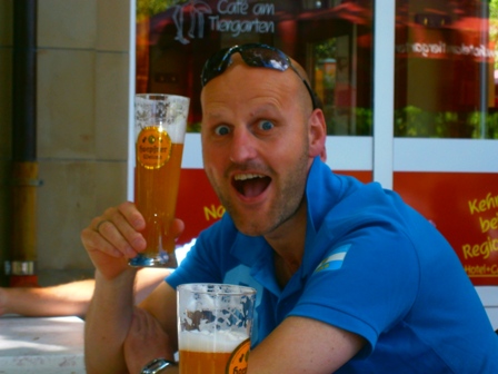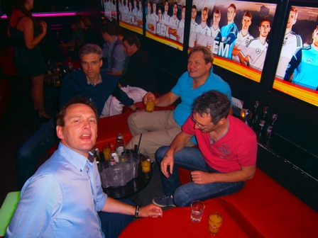 Karlsruhe by night bleek zo verkeerd nog niet. De Duitsers verkeerden immers in een overwinningsroes (winst op Griekenland). Eddie tikte voor Marcel een Duitse aanvoerdersband op de kop, Jan B. schommelde als vanouds op de dansvloer op – deze keer - Sean Paul’s Get Busy, er werd gedronken en gelachen. Op de wandeling naar huis liet Jan W. nog weer eens zien dat er met zijn richtingsgevoel echt van alles mis is (rechtsaf!), maar gelukkig was er gids Marcel (hier links).