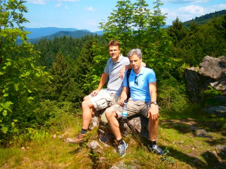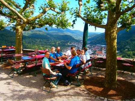 Op zaterdag was hiken het plan. Met de huurauto naar Baden-Baden voor een uitgepijlde wandelroute van tien kilometer, alwaar zich de groep splitste in een kopgroep en een achterhoede. Mooi was het er wel, zowaar vossen gezien (de kopgroep dan) en toch weer een paar calorietjes kwijt. Jonge mensen zag je er niet, in het bejaardenparadijs Baden-Baden. Een wedstrijdje ‘wie-ziet-het-eerst-een-vrouw-van-onder-de-dertig’ eindigde in nul-nul. Het terugbrengen van de auto had veel voeten in aarde. Klaas bleek überhaupt niet te kunnen autorijden, het verhuurbedrijf lag toch niet zo heel erg in het centrum en de door Jan W. geregelde taxichauffeur bleek niet geregeld. Niettemin eindigden we in het centrum, voor stapavond nummer twee. Traditioneel minder dan de eerste. Zo ook nu. Memorabel is alleen de nachtelijke ziekenhuistrip van Jan W., na een valpartij in het bad. De hoofdwond bleek, eenmaal nuchter, een hoofdwondje.