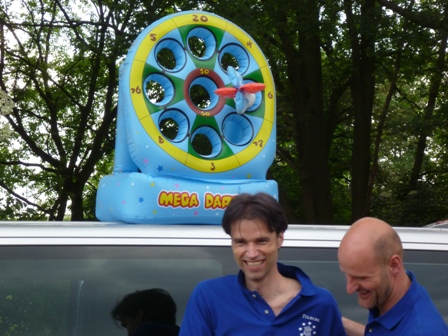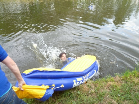 En dan de fysieke onderdelen: het lopen in een paterpak ging hem redelijk af, al zorgden de sandalen voor de overmijdelijke blaren en mocht het paterpak de abdij niet in. Bij de abdij was het overigens goed toeven in de zon, de Quadrupel van La Trappe (10 procent) zorgde voor een onmiskenbare flow. Waarna nog even snel wat onderdelen werden afgewerkt bij een plaatselijk slootje. De kano-opdracht werd goed doorstaan, maar gelukiig is Jan W. van mening dat iedereen een skinny-dip moet op zijn vrijgezellenfeestje. Het opblaasbare dartboard bleek nog niet zo'n eenvoudige uitdaging.