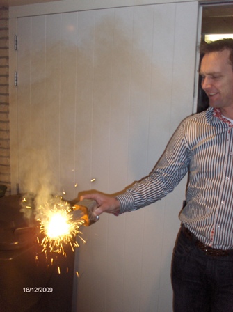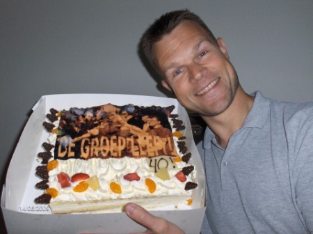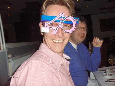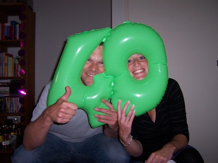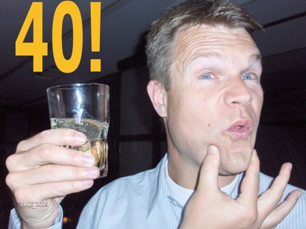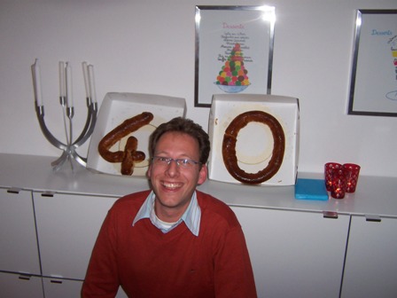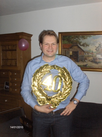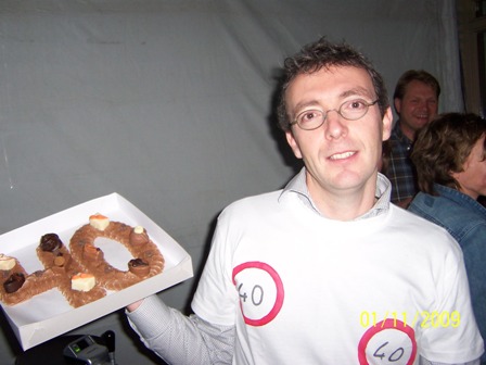 Met een voortreffelijke opkomst voor een mid-weeks event (7) en natuurlijk wel de gebruikelijke afzeggingen (2) werd de nieuwbakken veertiger 'overladen' met ouderwetse last-minute kadoos voor de man-die-alles-al-heeft: prachtige nostalgie met de Fawlty Towers-box (want veertigers kijken vooral terug, schijnt het), nieuw inspiratiemateriaal voor nieuwe imitaties (waar de familie ook nog wat aan heeft) middels de Sinterklaas CD van Bassie en Adriaan, een alleen bij de echte kenners bekend boek van een Nobelprijswinnaar (na de veertig kan het leven wel wat verdieping gebruiken), een last minute en dus verse mega 40 letter van de bakker (zie foto) en het hoogtepunt: genoegdoening na het afgelopen zeilweekend (zie eveneens foto).
