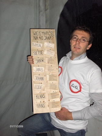 De derde veertiger in ons midden besloot dit (ook) niet ongemerkt voorbij te laten gaan: Marcel. De slijter uit Maarn had zelfs een partytent mét heater afgeleverd, waardoor het gezelschap buiten (in de regen) warm en droog stond. De oorspronkelijke toezeggingen van acht guys om te komen werd binnen 48 uur teruggebracht tot vijf. Zelfs zijn levensgabber uit Beijum vond de kwast belangrijker dan een toast op veertig levensjaren ('die is even uit mijn top 3 gestuiterd'). Het mocht de pret niet drukken; gelukkig heeft Marcel meer vrienden. De rijkelijk aanwezige kinderen konden hun lol niet op in de 'spel-knutsel-en-tv-zolder' en Marcel werd twee boeken rijker (over religie en muziek), een chocoladecijfer 40 en het hoogtepunt: het door Eddie gefabriceerde spel 'Wie is Marcel na 40 jaar?'.