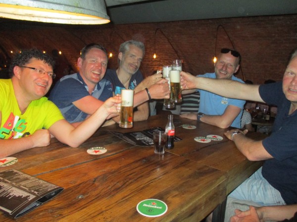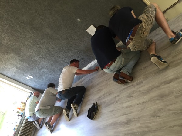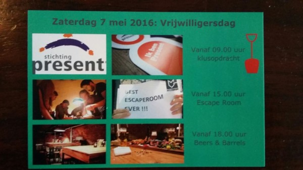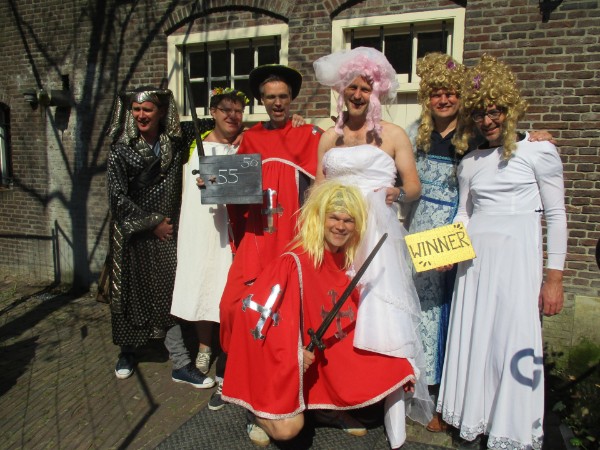 Vrijwilligersdag Eddie, vrijwilliger van het eerste uur, organiseert met Johan op 7 mei 2016 de eerste (?)Vrijwilligersdag. In Utrecht gaan we laminaat leggen bij een licht verstandelijk gehandicapte mevrouw die wel wat hulp kan gebruiken. Ondanks dat laminaat leggen niet tot de standaard competenties van menig groepslid behoort, leggen we bijna het hele appartement in een paar uurtjes strak vol met laminaat. Jan B. zorgt intussen voor wat bloemetjes als aankleding en zelfvoldaan vertrekken we rond drie uur naar het centrum voor een welverdiende verfrissing. Daar wacht ons echter een een Escape Room. Een open lucht activiteit had gezien het stralende weer wellicht wat meer voor de hand gelegen, maar de Escape Room was niettemin leuk om te doen. Wat de verkleedpartij-voor-de-foto er aansluitend mee te maken had weet verder niemand, maar gewillig doen we daar natuurlijk aan mee. Eddie loopt nog bijna een hersenschudding op in de Utrechtse gewelven, deed een beetje huilie-huilie, maar ging natuurlijk wel gewoon mee naar het terras en (later) het kiprestaurant met de eigen biertap. Jammer dat we allemaal met de auto waren... Kort en goed: uitstekend dagje. Wordt vast vervolgd.